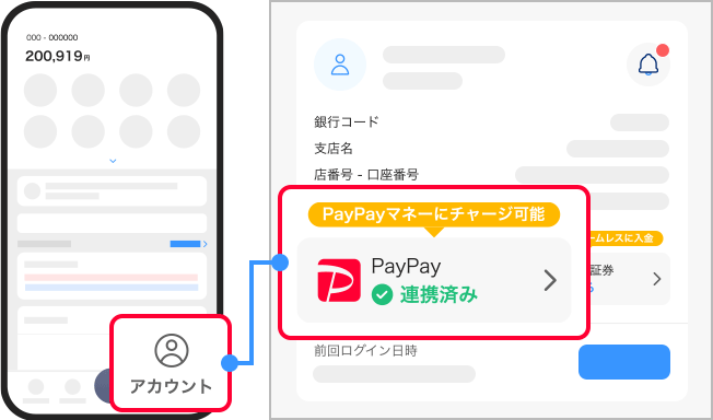 - PayPayのチャージ用口座にPayPay銀行をご登録済のお客さまもPayPayアカウントの連携が必要です。